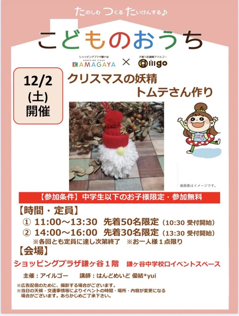 【12/2(日)】クリスマスの妖精トムテさん作り「こどものおうち」 ショッピングプラザ鎌ヶ谷×アイルゴー